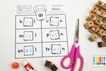 Students write or stamp the missing letters onto the squares. Encourage students to practice the sound aloud as they write. Next, students cut and paste the squares in the word blanks above to complete the word.