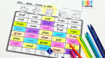 This fast-paced dice game encourages students to put their new reading skills to the test. Students take turns rolling the die and finding the matching column. Students must read and color the next available word in the corresponding row, working their way from the bottom up. The student to color and read the final word in any column wins. This game can be played as single player as well, students are eager to see which animal will win the race!