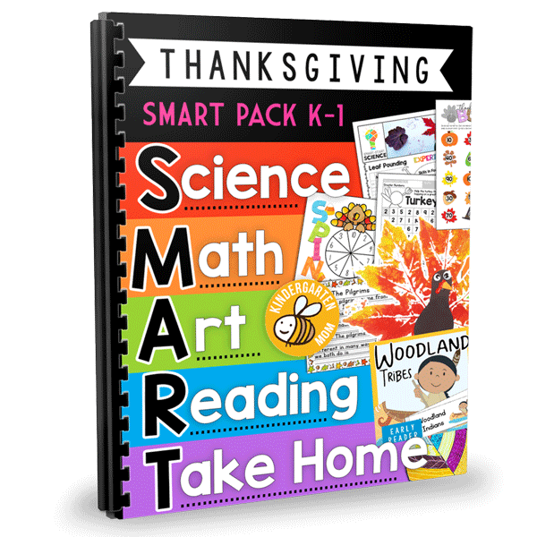 SMART: Science, Math, Art, Reading & Take Home activities for Thanksgiving!  This helpful set is filled with a week's worth of fun, educational math games, hands-on activities, science experiments, art projects, early readers, writing prompts and a Bible memory verse.  Everything you need to add a little holiday fun to your kindergarten classroom this year!